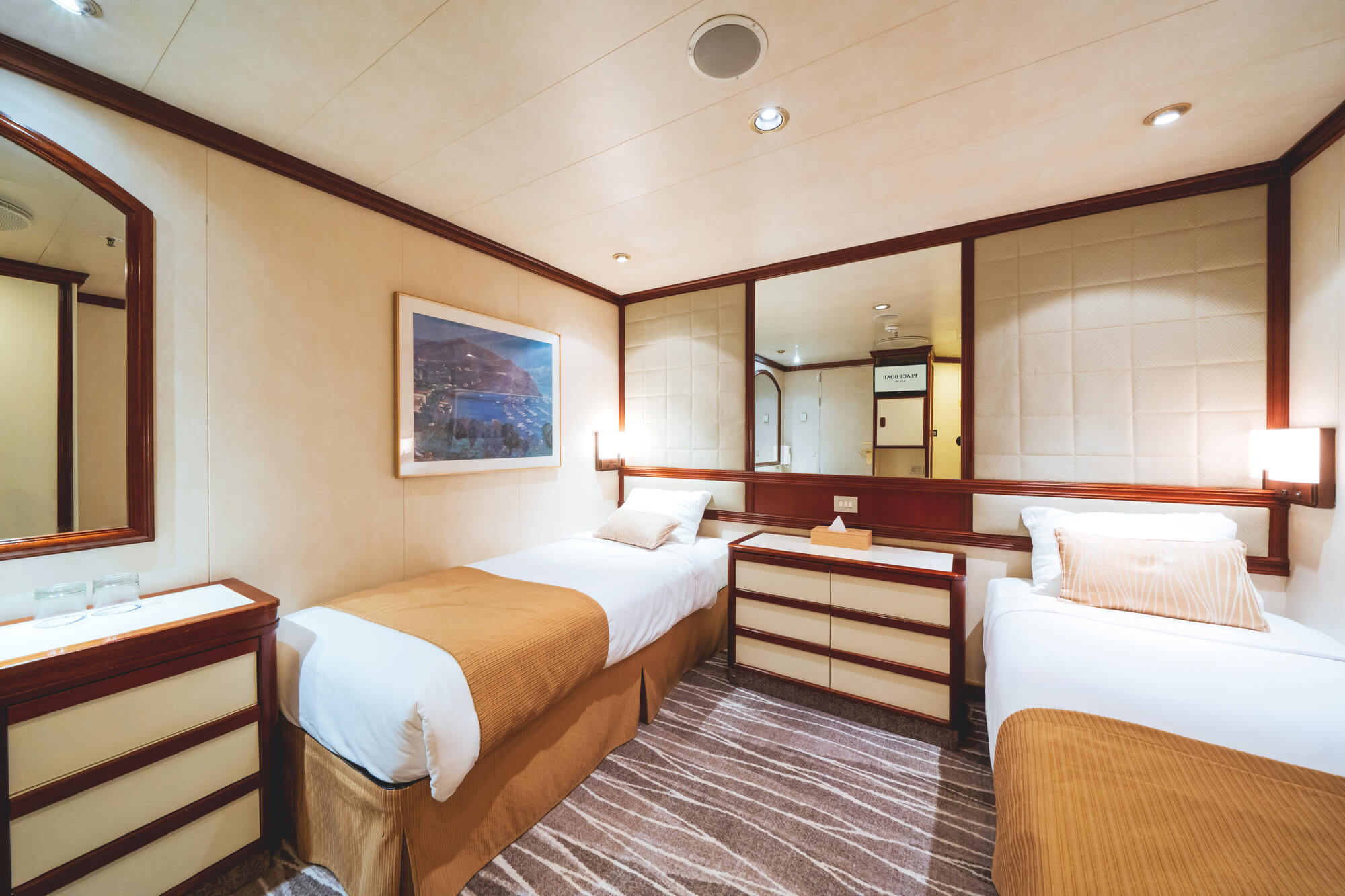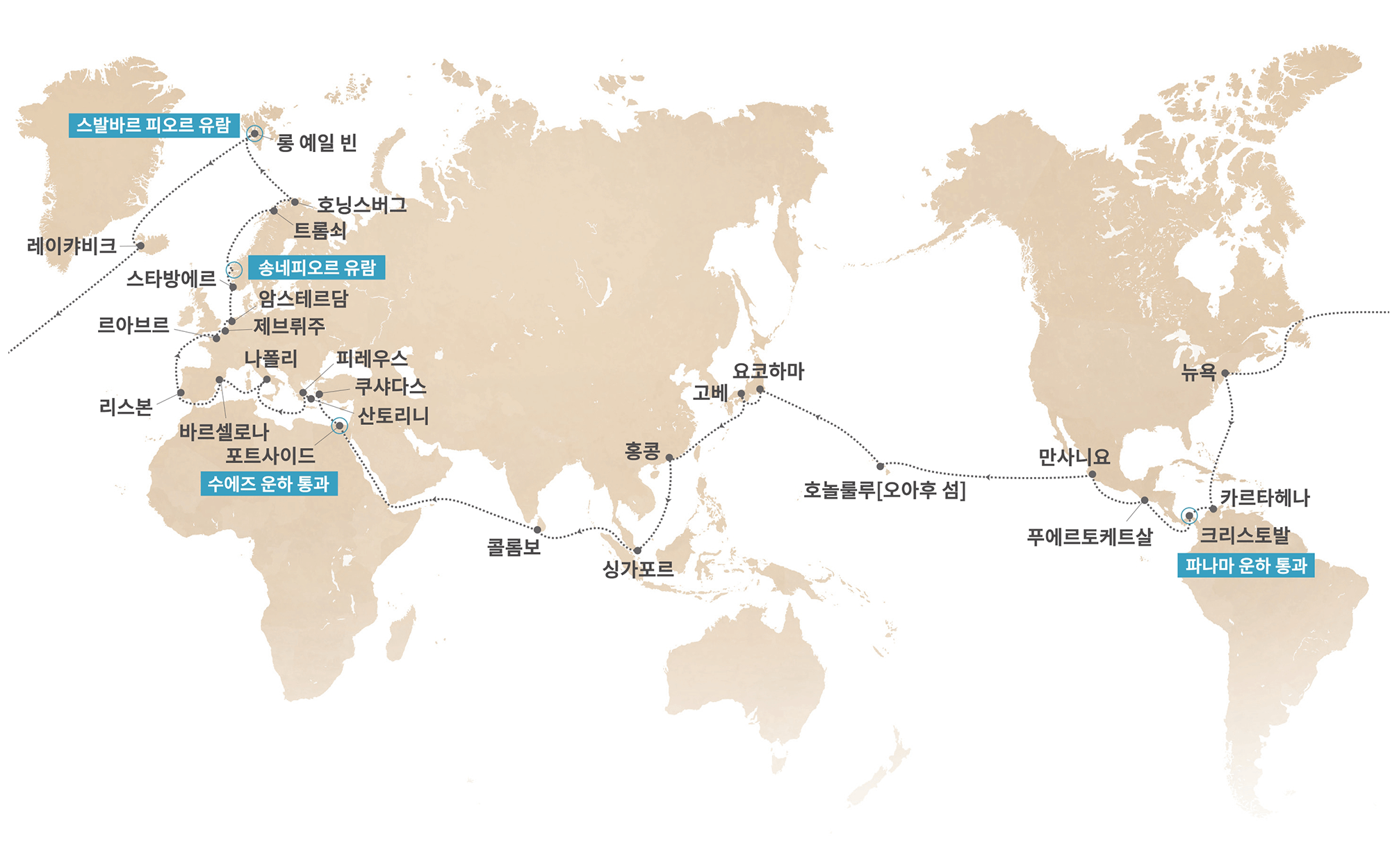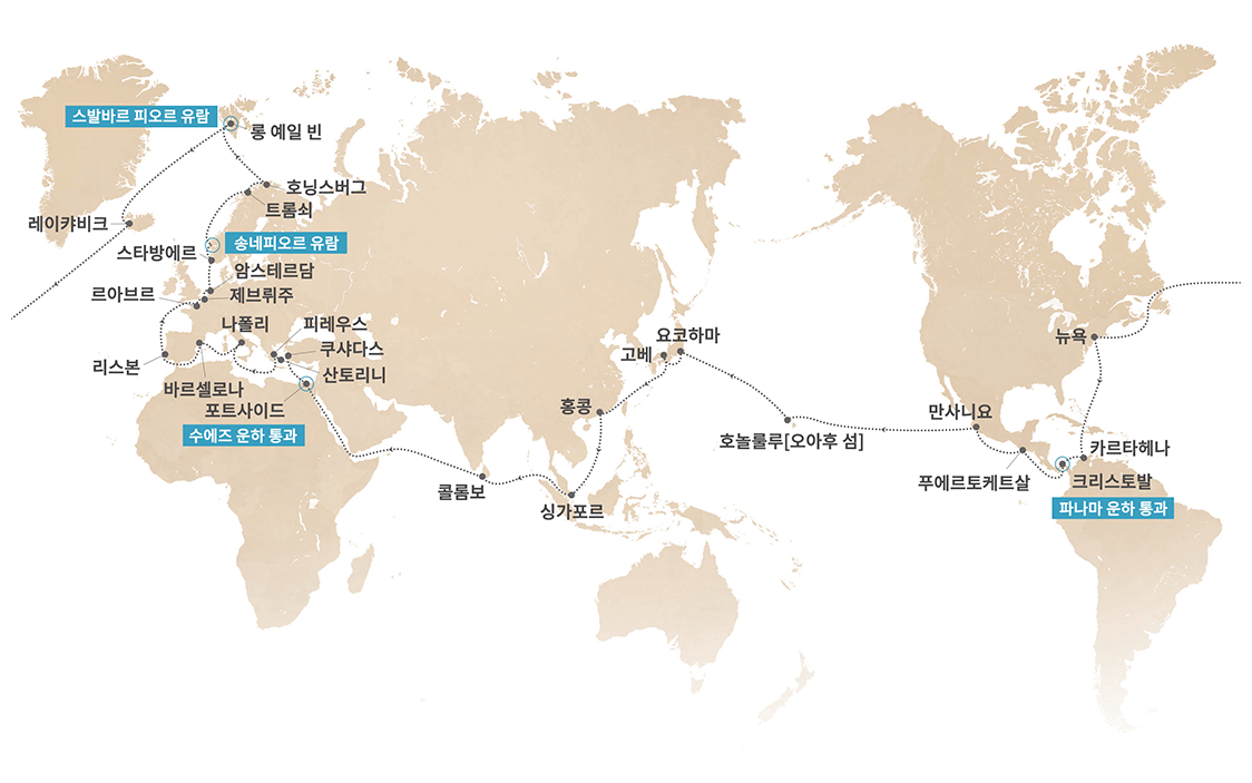 여유로운 선내 공간과 여행을 위한 다양한 시설을 갖춘 본 객선은 승객분 한분 한분에 대해 안전하고, 안심하고 즐길수 있는 세계일주 크루즈 환경을 제공합니다